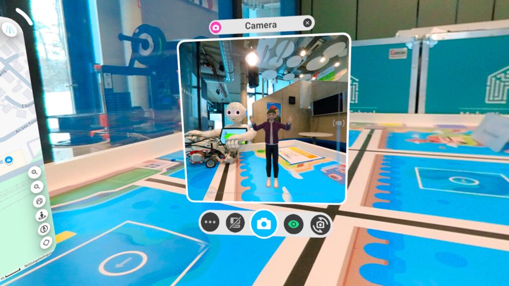 Spannend war dann das VR Projekt der VR Familie in Meta Horizon Worlds, eine Marswelt, die zur Müncher Systems eröffnet wurde. Das Besondere daran waren die ‚Sprachinseln‘, die man im Bild druch die Lautsprechersymbole sehen kann. Dort wird auf Englisch oder Deutsch erklärt was man gerade sieht.